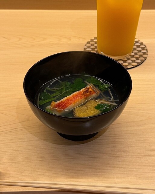 お椀物は"金目鯛と鮑と三関セリのお椀"、ずっと飲んどきたいお出汁。