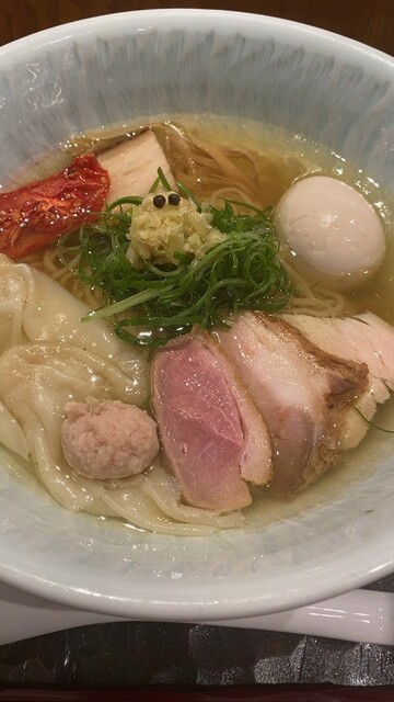 開店直後に来店。予想通りすでに並んでいる。30分ほど待って中に入れた。まず、内装が物凄いキレイで、今までのラーメン屋さんで一番だ。常連さん?っぽい方が多数いらして、大将が愛想良く話していて、かなり好印象だ。ラーメンは塩とシュウマイにしてみた。まず、シュウマイは、肉汁、やわらかさ、完璧な一品。今まで食べた中でナンバー1である。