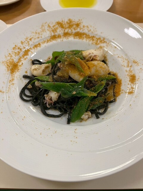 前菜は、燻製のサーモンや、生ハムと洋梨など、おしゃれな食べ物があってどれも美味しく、パスタもイカ墨を練ったパスタでなかなか他では食べれない料理を堪能することができた。