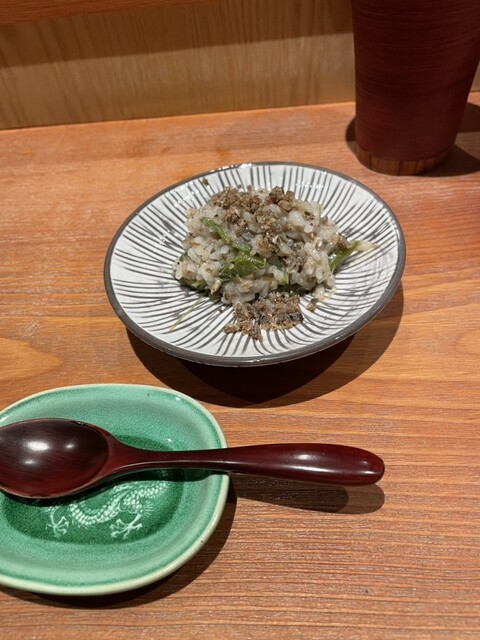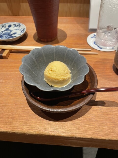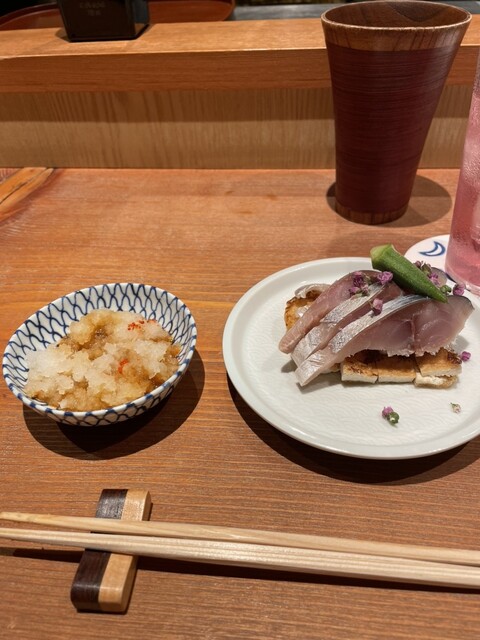 7000円のコースをいただきました。 先付け、お刺身、強肴から一品、野菜肴から一品選んで、そのあとアラカルトを選ぶ形式の料理屋さんです 鮎粥、鯖の刺身、鱧焼き、ハンバーグ、ずいき、糸瓜をいただいたあとアラカルトで、トウモロコシの天ぷら、鰻の春巻き、鯖寿司
