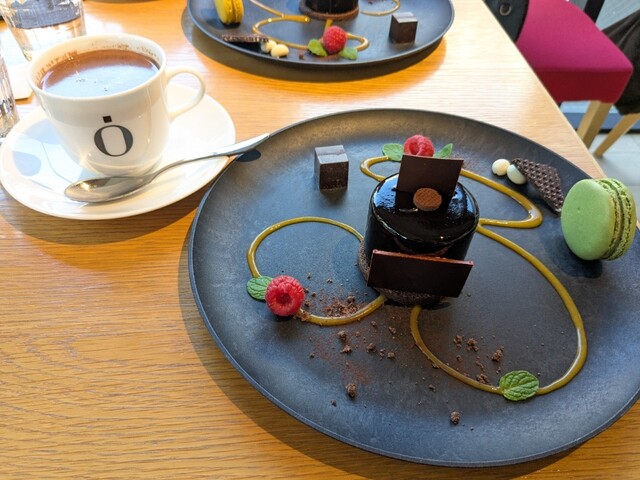 2階のカフェスペースでいただいたのは、ケーキのほかにマカロンやチョコがセットになったスペシャリテ。一つ一つ丁寧に作られており、全て美味しかったのですが、特に「ブボチョコデラックス」が印象的でした。濃厚で奥深いチョコレートの味わいが堪能できる一品で、コーティングの中には種類の違うチョコが層になっています。それぞれの層を別々に楽しんでも良し、まとめて口に入れても調和のとれた甘さが楽しめます。一つのケーキでここまで満足感が得られるのはなかなかありません。