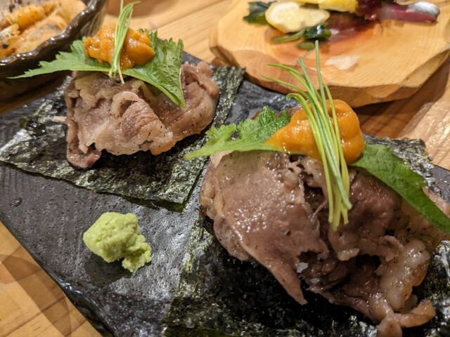 うにくもあります。調子乗って注文してみたら、ウニを切らしてるとのことで、かわりにイクラなら……と提案がありました。「黒毛和牛にイクラ……?合うのか……?」と思ったのですが、びっくりするくらい贅沢な味がしました笑