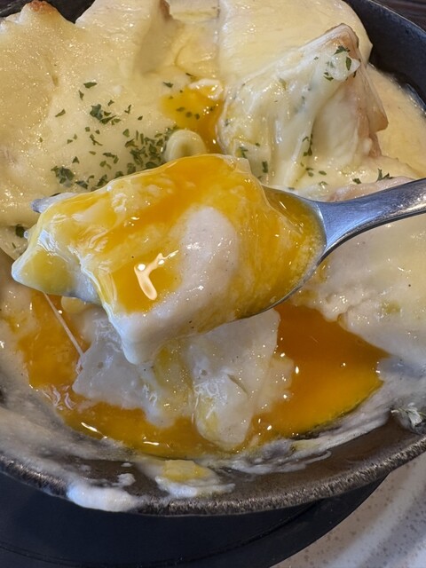 モーニングにパンチーズグラタンをオーダーしました。グラタンの中には、半熟の玉子がドロっと隠れており、サプライズでした。黄身と絡めてパンが進みました。