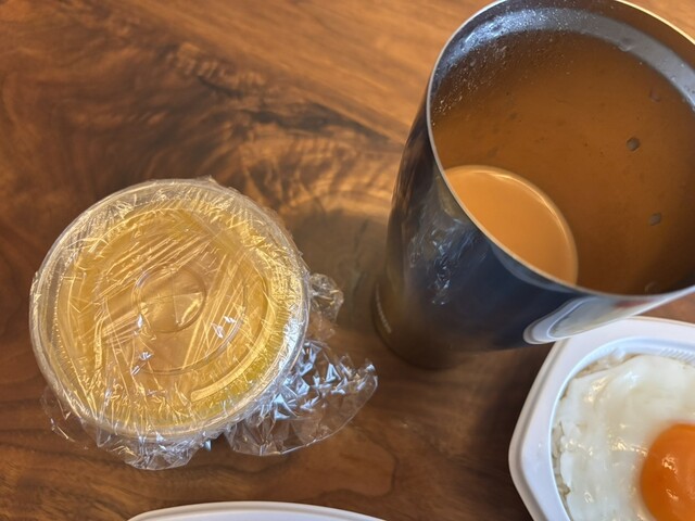 A弁当サグマトンカレー690円と、D弁当ガパオライス弁当790円をテイクアウト。サーモス対応のタンブラーを持参すると温かいホットチャイティーもテイクアウト対応してくださいました。ドリンクは+200円。マンゴージュースも濃厚で美味しい!