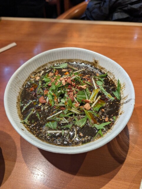 メインの黒担々麺は痺れが効いていて飽きのこないお味。辛さはあんまりなかったかな。黒酢で味変も楽しめます。私的には麺も細麺でタイプ。スープに絡んでやばい、スープも旨くて飲みすぎてやばい、前菜もおかわりしてやばい。食べすぎましたが大満足!!
