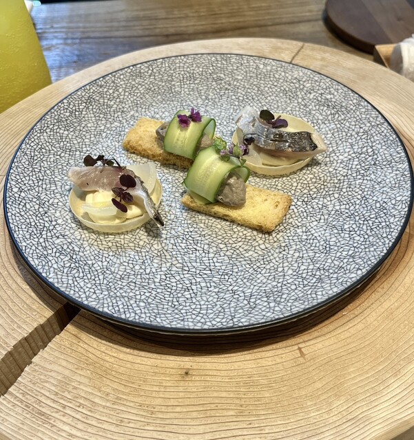 軽く薪で炙られた鯵、燻製マッシュポテト、マリネされたペコロスを一口で♩鯵の美味しさがたまらない一品で手でパクリといただきました!