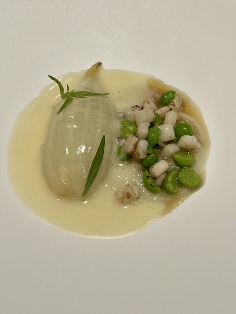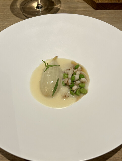 温菜は新玉葱のローストに、ヤリイカとグリーンピースが添えられています。シードルバターソースとじっくりローストされた玉葱の甘味、ヤリイカの食感が最高❣️野菜美味しすぎる。