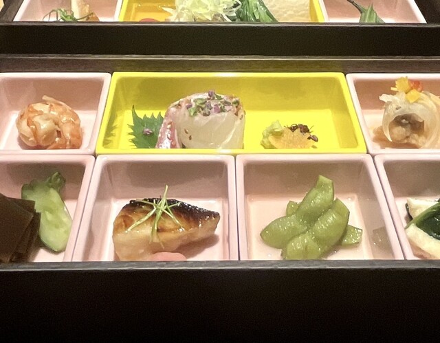 蓋を外すと色とりどりのお料理が⤴️二段になっていて小鉢がずらり。出来立ての鯛のあら炊きが入って完成です!