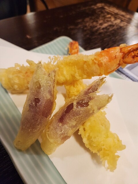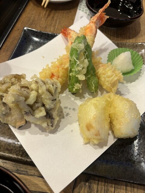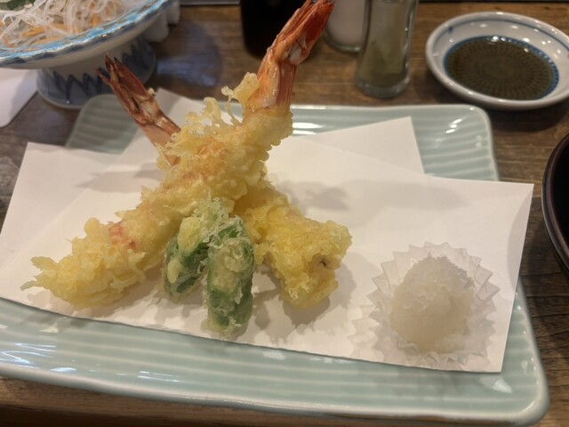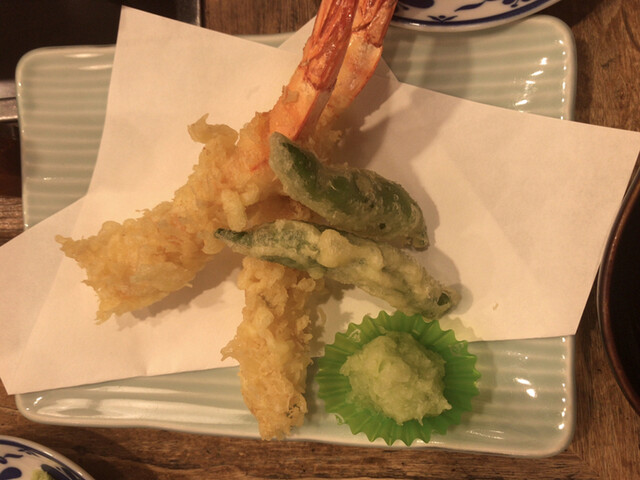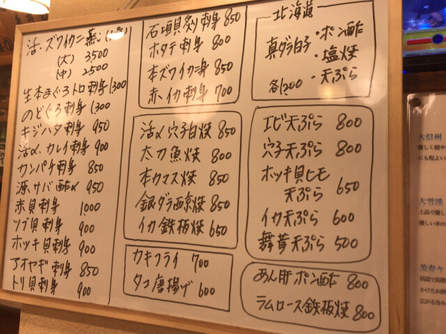 カウンター横のオススメメニューを見ながら、おまかせで『刺し盛り』と『海老天』や『ゲソ天』と言った酒のツマミを注文