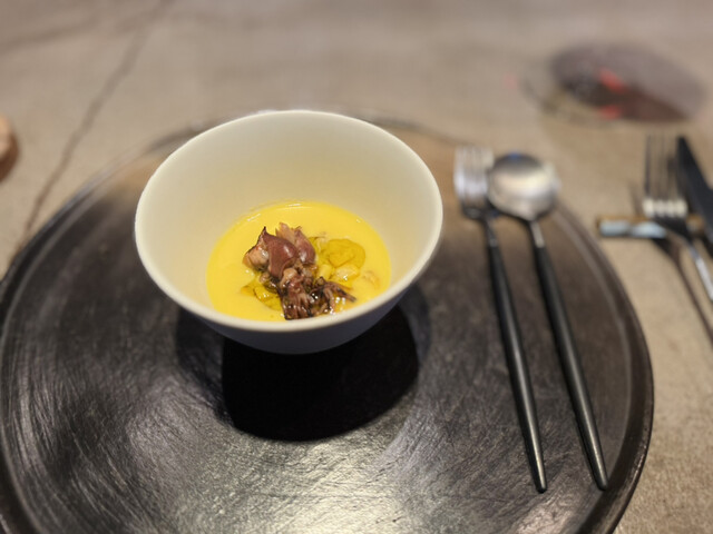 一見シンプルながら、その奥行きに驚かされる冷製スープ。甘みの強いコーンの滑らかな口当たりに、燻製ホタルイカの香ばしさが重なり、まるで“飲む前菜”のような満足感。ひんやりとした口当たりの中に、しっかりとした旨味の輪郭があり、素材へのリスペクトが感じられる逸品でした。コントラストの美しさを五感で楽しめる、夏のはじまりにぴったりの一皿かと思います。