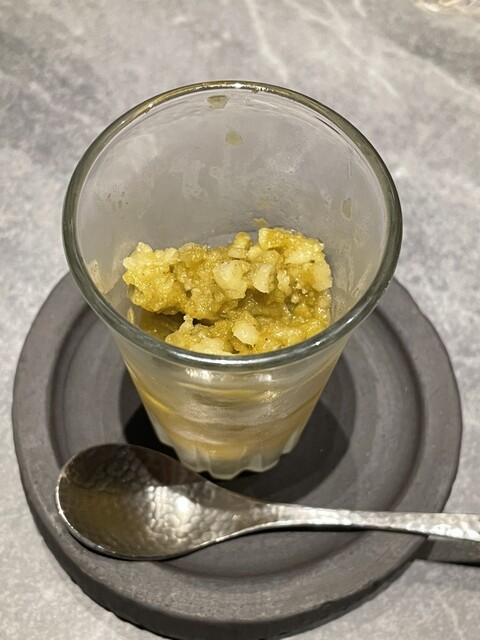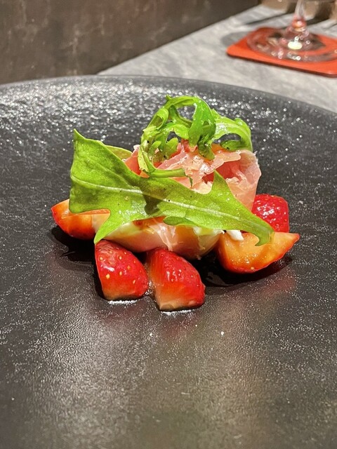 季節のフルーツを使った前菜は、甘みと塩味のバランスが心地よく、コースの導入として完成度が高いです。