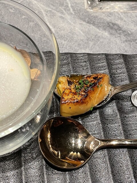 サイフォンで仕上げる自家製コンソメスープは、グラスに注がれ、香りを楽しんでからいただきます。2週間熟成のタンは希少性だけでなく、柔らかさと旨みの深さに驚かされます。とにかく柔らかく、一口だと大きいけど、噛み切れるかなー?ナイフかなーと考えつつ、がぶりといくと、簡単に噛める柔らかさでした!