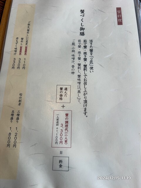 時間通りに着きました。早速、1階で希望の蟹を選びます。香箱、ズワイ、各種魚も選びます。ズワイは焼きとかに刺しで。とご飯は炊き込みご飯とも一つも頼みました。甘エビは調理無しで。ノドグロは焼きで、白子は天ぷらにしてもらいます。