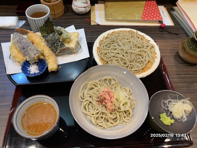 メニュー見て、天そばセット(2,000円)私はおろしとざるを。連れはおろしととろろで。細打ちを選択。