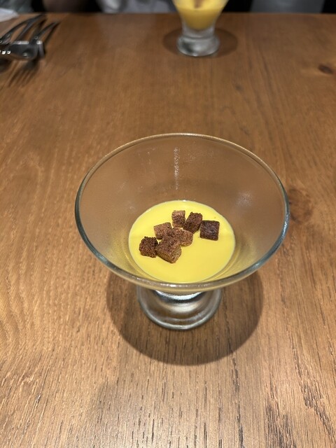 スクランブル交差点の角、セブンイレブンの上、2階に有ります。スクランブルで集合して階段を登ります。あらかじめ食べログでコースを予約して行きました。週末なので。最初の前菜?カボチャのスープクルトンが乗ってます。これが濃厚ど一気喰いしてしまいました。お次は3種のプレート、一つ一つが美味い。アカイカのも美味かったなあ。