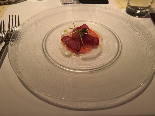 ■ 赤海老のマリネと紅くるり大根のラビオリ仕立て ディルの香りとライムのアクセント