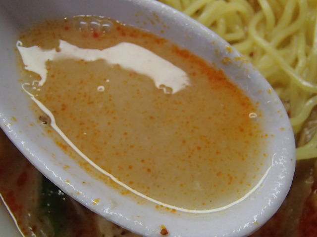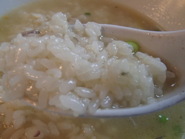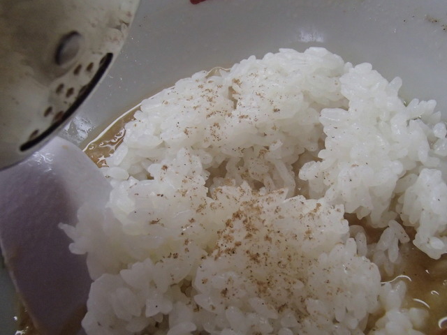 そして、「特製坦々ラー油」をトッピングし、良く混ぜていただいた後、「追いライス」¥100を残ったスープに投入し魚粉を入れていただきました。
