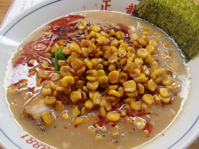 緊急事態宣言発令による昼正龍 濃厚白鶏麺 パイチーメン 焼きもろこし盛+例のラー油をトッピング