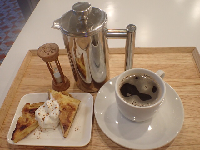 本日の定食 ドライチキンカレー 副菜二品、豚汁 500円 + 月曜日のお菓子 パンプディング 1個50 + ホットコーヒー 100円