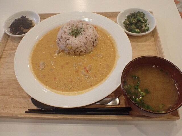 今週の週替わりセット Bセット クリーミーレッドカレー 副菜二品、豚汁 500円