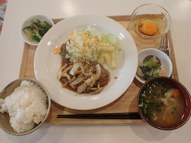 朝定食 目玉焼き 副菜二品、豚汁、ご飯 100円