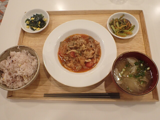本日の定食 牛肉のトマト煮 副菜二品、豚汁、ご飯 500円