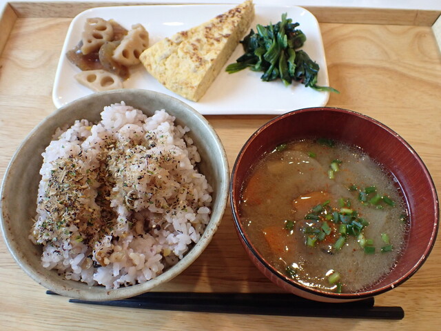 朝ご飯 野菜のキッシュ 副菜二品、豚汁、ご飯 100円