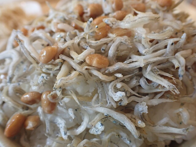 朝ご飯 野菜のキッシュ 副菜二品、豚汁、ご飯 100円 + 納豆 50円 + じゃこ 50円