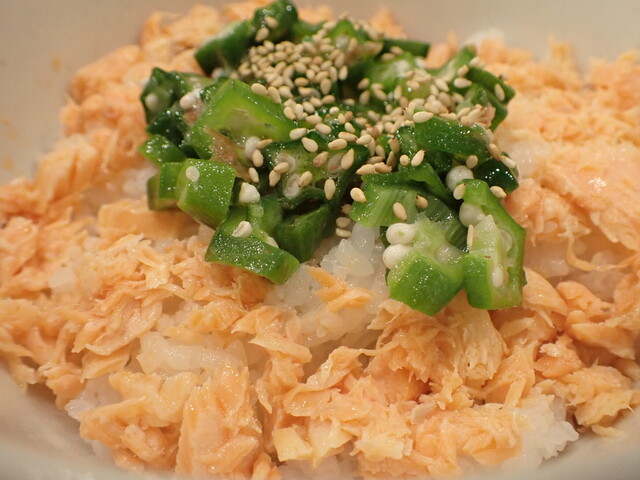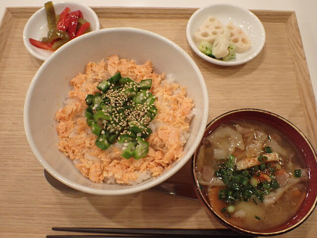 今週の週替わりセット Aセット 鮭おくら丼 副菜二品、豚汁 700円 + 月曜日のお菓子 パンプディング 1個100円 + ホットコーヒー 150円