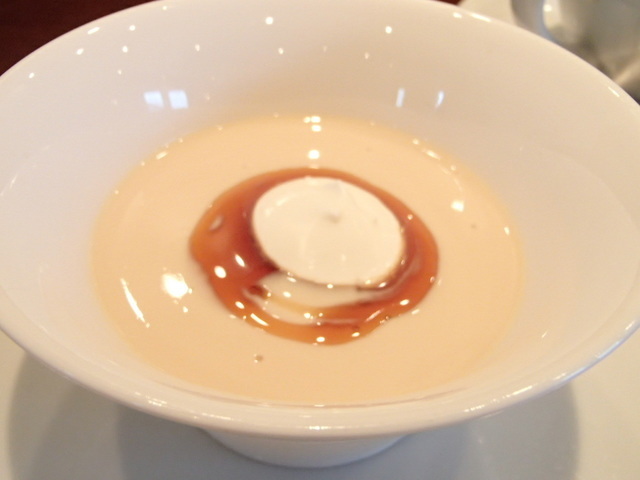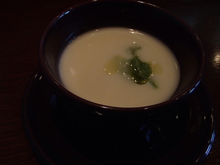 「グラスワイン 白」¥700を先ずいただき、「カリフラワーのスープ」からスタートです。