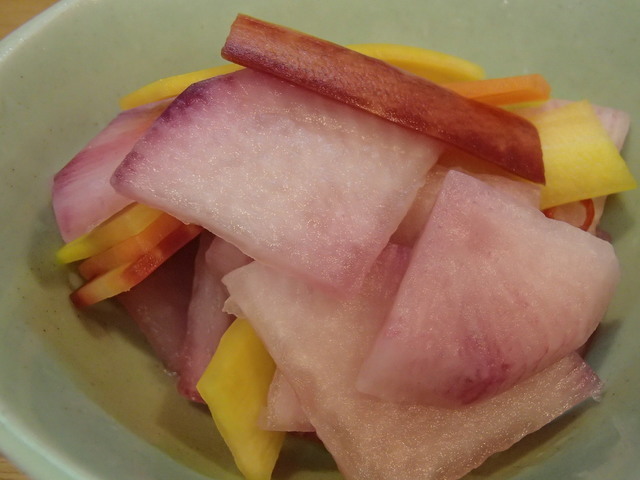 きりんざん 伝統辛口と選べるお通しより紅芯大根と水菜の浅漬け