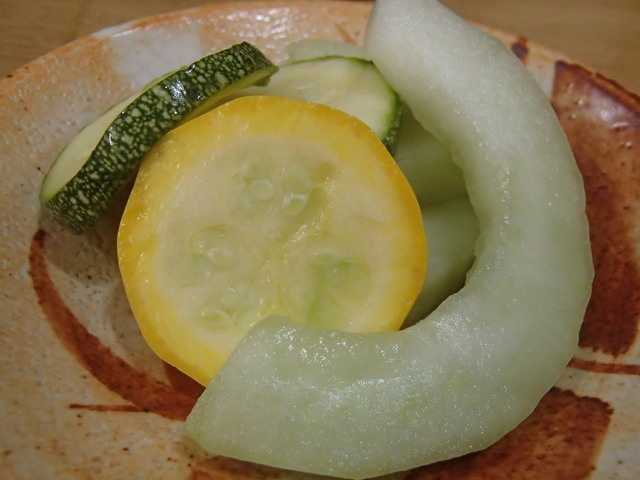 羽根屋 純吟煌火、選べるお通しから、セロリとみょうがの浅漬け