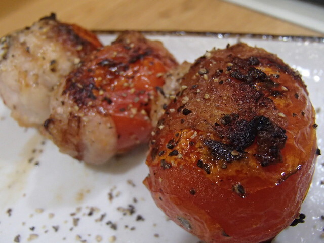 「陸奥 八仙 赤ラベル」¥1078に切り替え、「トマトとカマンベールのサラダ」と「おまかせ5本串」¥760をオーダーしていただきました。