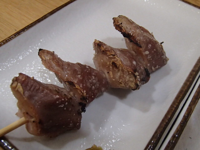 「すなぎも」、「ささみわさび」、「レバー」、「にんにくま」、「茶エノキ茸の豚巻き串」の5本でした。
