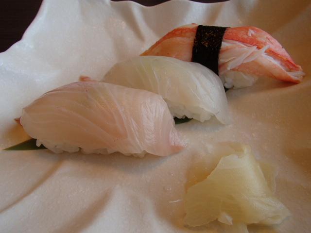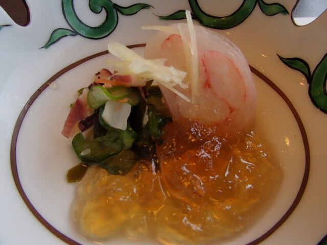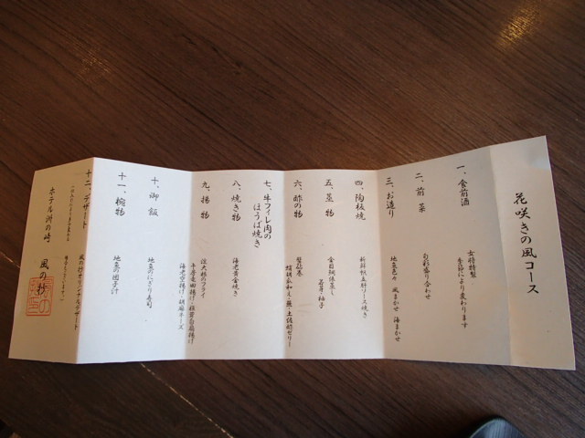 食前酒は「パイナップル酒」、「前菜」、「お刺身(タイ・カンパチ・アオリイカ・マグロ・ソウシハギ)」、「帆立クリームの陶板焼き」、「蒸物」、「酢の物」、「牛フィレ肉ほうば焼き レア」、「スズキ」、「にぎり(スズキ・ヒラメ・玉子)」、「かんぱちのつみれ汁」、「風の抄オリジナルデザート」と言う「花咲きの風コース」¥8000を堪能しました。