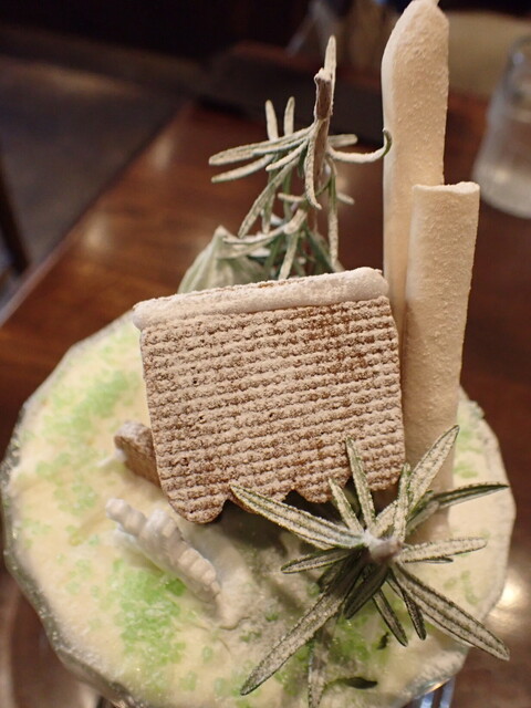 スパイスクッキーで作った小さなお菓子の家ヘクセンハウスにローズマリーシュトロイゼルやピスタチオアイス、レモングラスとライムのジュレなどボタニカルなパフェはヨーロッパの雪景色を思い浮かべる一品で食べるのが勿体ない感じでした。