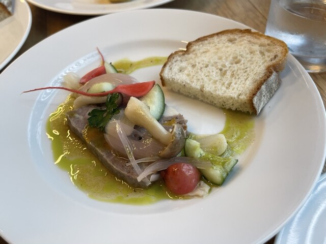 ラムのテリーヌに野菜の酢漬けがトッピングされています。テリーヌはラム肉の肉感がしっかりしていて旨みが詰まっています。野菜の酢漬けと食べるので前菜としてさっぱりと食べることができました。