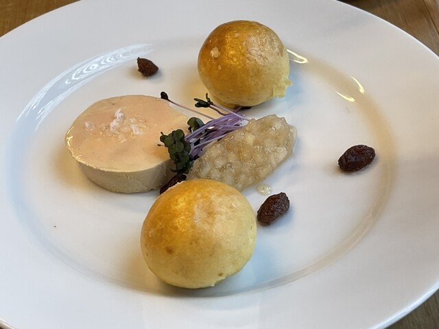 鴨のフォアグラは旨みが強く濃厚で舌触りもいいです。レーズンやリンゴゼリーの甘さや酸味と合わさって上品でさわやかになりすごくおいしかったです。