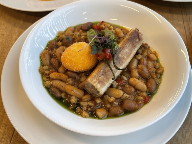 ショーレットは白インゲンなどの豆と押し麦を煮込んだ料理だそうです。オニオンやパプリカで味付けされています。そこにパリっとした薄皮で包まれた鴨のコンフィがのっています。外はパリッとして中はしっとりで鴨の旨みも味わえておいしいかったです。