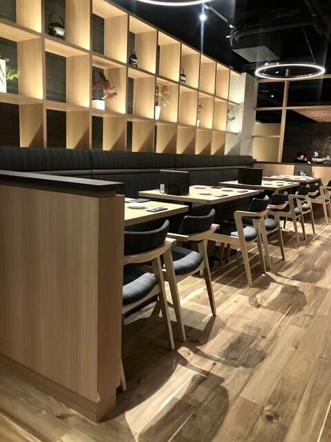 広いエントランスから店内に案内されると、先ず調理場が見えるオープンキッチンのカウンター席が有り、そこを曲がると予想以上に奥行きのあるテーブル席が広がっていてビックリ!