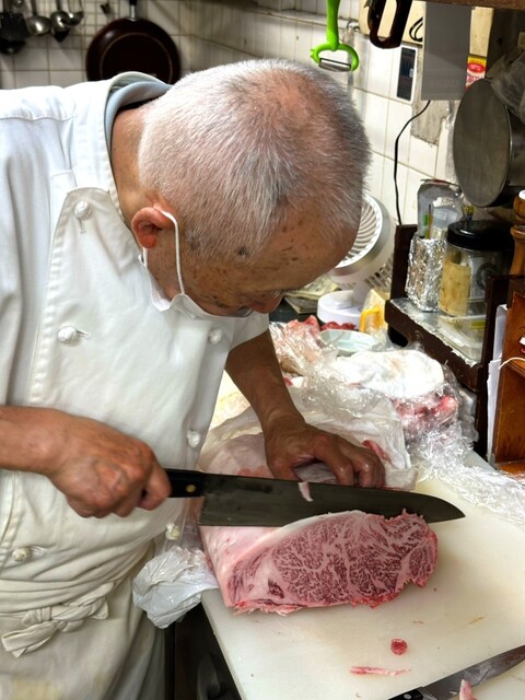ドデカいお肉の塊を手切りで切ってく