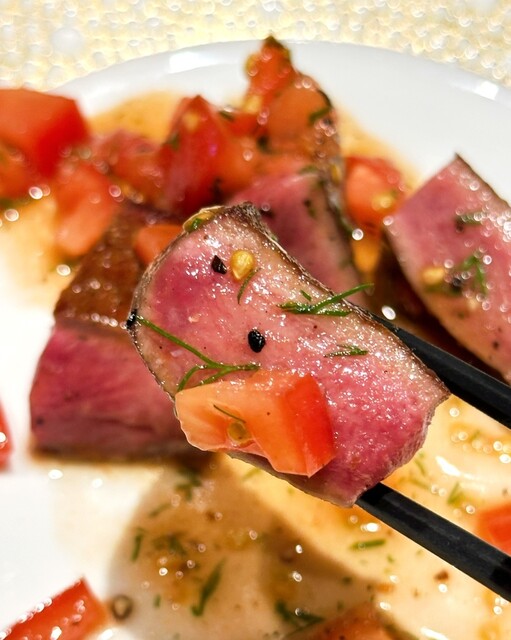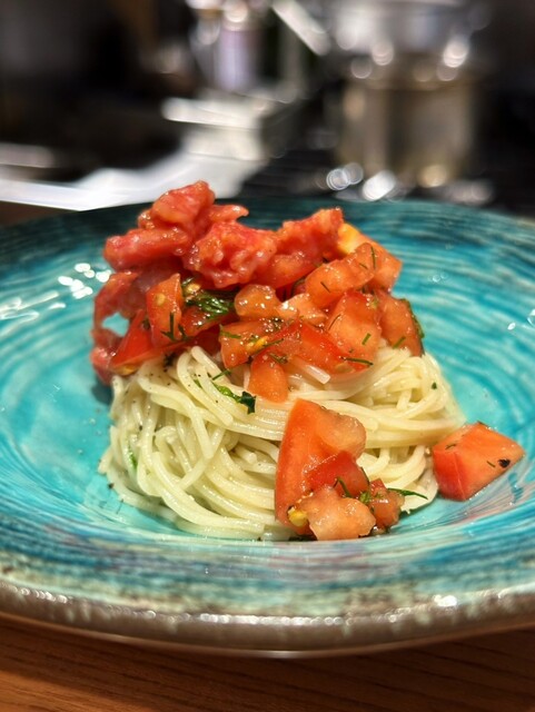 極細麺の温パスタにユッケの脂と爽やかトマ