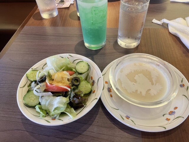 サラダと冷製スープにハンバーグとライスとドリンクです。