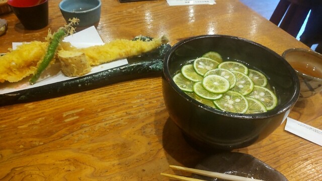 主人は すだちのお蕎麦と穴子一本の大きな天ぷらが一緒になったもの、娘は鴨南、私はランチセットで天丼とお蕎麦をあとは一品もののだし巻き卵と 鴨のつくねをお願いしました。