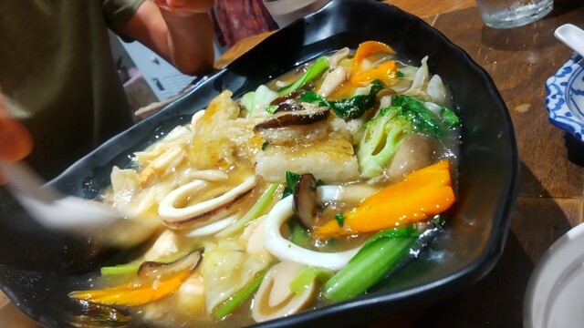 海鮮あんかけ焼きそばは…実は私の好みではありませんが、主人が好きなので…でも、びっくり!楽しいメニューでした。美味しかったけど、お腹にこたえて…デザート断念…くぅ