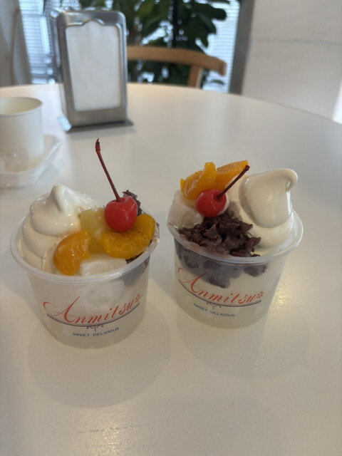 「お母さん、あんみつ買って来るね」と売り場に戻りあんみつ購入してソフトクリームのっけてもらいました。