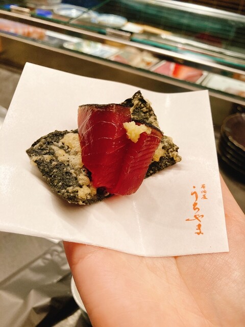 料理人から突然天紙を渡され「なんだろう?」と思っていると、からっと揚げられたパリパリの海苔に厚めにカットされたカツオが登場!海苔の風味と生姜が効いたカツオの新鮮さを感じる味わいがたまりませんでした。