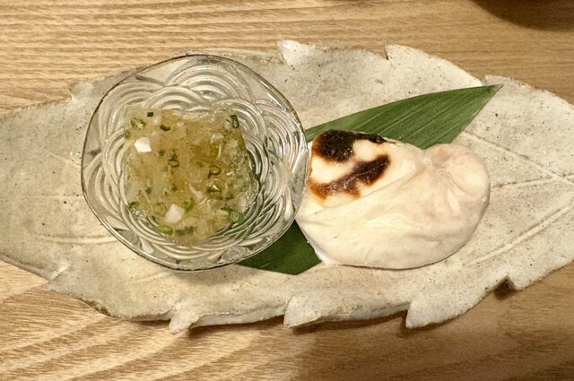 続いてふぐの白子の登場です。鱈の白子はよく食べますがふぐの白子は食べたことないかも…。表面を焼いてあって、大きい白子です。香りもグッド!ほんの少しポン酢を垂らしていただきます…コレは美味いっ!品の良い甘さが最高です。焼き目のところが香ばしく、中はトロトロで、コレはもう日本酒が止まりません。幸せです。