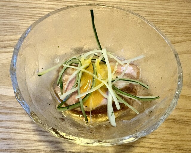 まずは先付けから。合鴨のローストの登場です。出汁が美味しく、鴨肉も柔らかくて、旨味たっぷり。美味しい!素晴らしいディナーを予感させます。