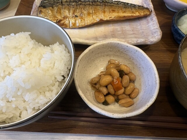 大きな鯖と大根下ろし、味噌汁、ご飯、漬物、箸休めの煮豆。鯖が香ばしく美味しいですね。...